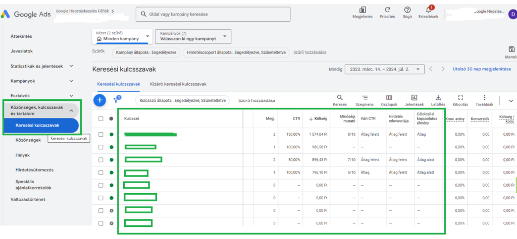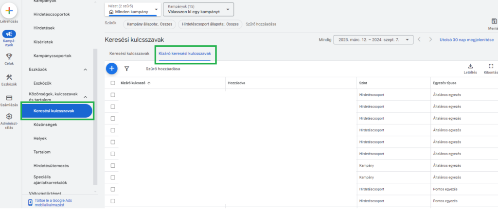 Kezdd azzal, hogy áttekinted a keresési kifejezések jelentéseit a google ads felületén, hogy lásd, mely lekérdezések váltják ki hirdetéseidet, de nem vezetnek konverzióhoz. Ezeket a kifejezéseket hozzáadhatod a kampánybeállításokban kizáró kulcsszóként. A kizáró kulcsszólista rendszeres frissítése segít fenntartani kampányaid hatékonyságát.