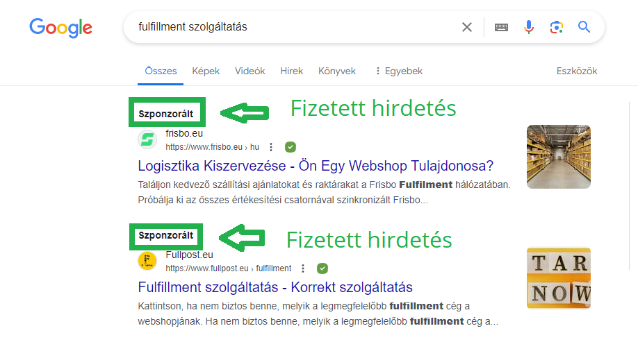 - Mi ez? Ezek a „klasszikus” Google hirdetések, amelyek szöveges formában jelennek meg a Google keresési eredményoldalain (SERP), amikor a felhasználók az általad megadott kulcsszavakra keresnek.