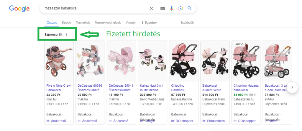 - Mi ez? Termékképeket, árakat és üzletneveket tartalmazó hirdetések, amelyek a Google Keresőben (a szöveges hirdetések mellett vagy felett) és a Google Shopping lapon jelennek meg.