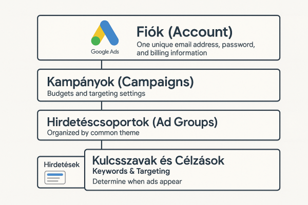 Mielőtt belevágnánk a különböző kampánytípusokba, fontos megértened a Google Ads hierarchikus felépítését. Ez segít a kampányaid logikus megszervezésében és kezelésében: