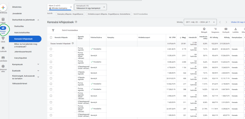 Ezeket a Kampány -> Keresési kifejezések fülön tudjuk csekkolni.