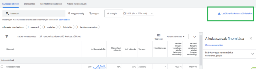 Ezután ezeket a kulcsszavakat letudod tölteni sima táblázat vagy Google táblázat formájában, ha rákattintasz a letöltésre.