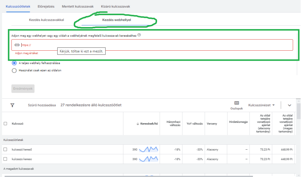 A google kulcsszótervezőbe, nem csak kulcsszavakat tudunk beírni, hanem megtudunk adni konkrét weboldalakat és aloldalakat és a kulcsszótervező az oldalból fog kiindulni, hogy mik a releváns kulcsszavak.