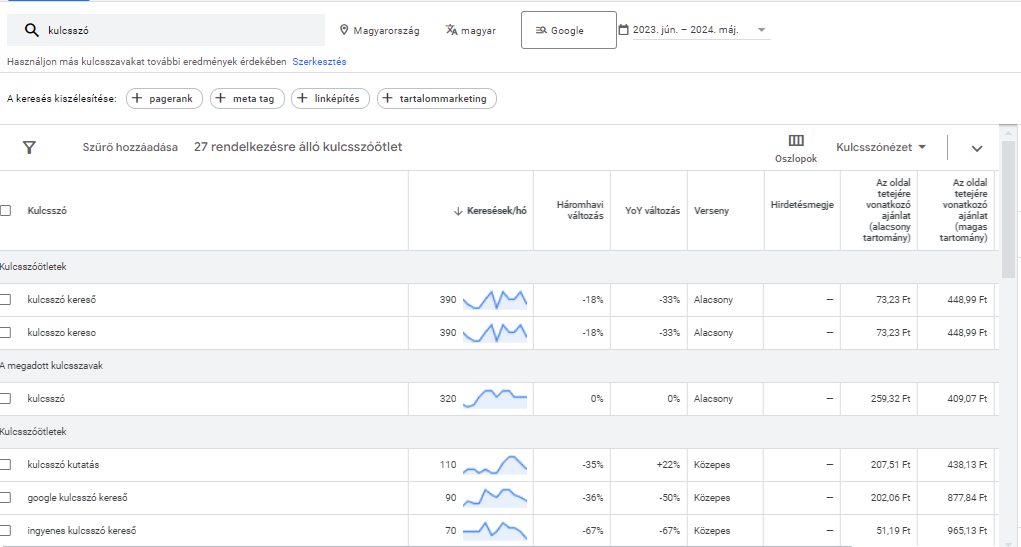 Látni fogod a havi keresési mennyiséget a kiválasztott nyelven és területen. Ha ráviszed az egeret a grafikonra akkor visszamenőlegesen is fogod látni a keresési mennyiségeket hónapra lebontva.