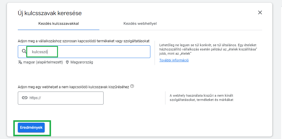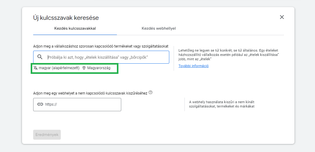 Első lépésben válaszd ki a területet és nyelvet ahol keresni szeretnél kulcsszavakat.