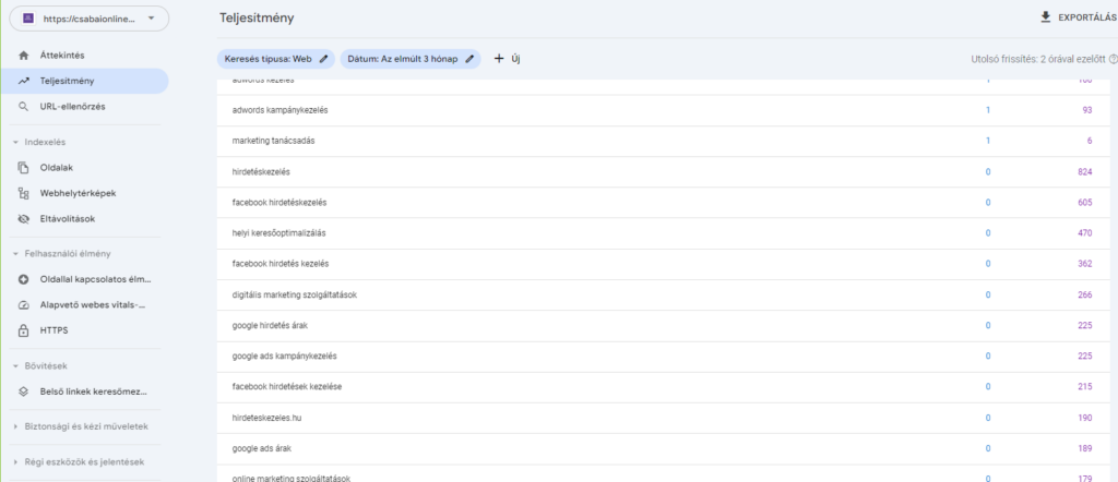 A Search Console részletes adatokat nyújt arról, hogy mely keresési kifejezésekkel találják meg a felhasználók az adott weboldalt, és milyen gyakran jelenik meg az oldal ezekre a kifejezésekre ar organikus keresési találatok között.