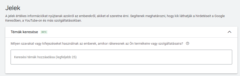 Témák keresése : Itt mint egy keresési kampánynál add meg a kulcsszavakat ami kapcsolódik az adott elemcsoporthoz.