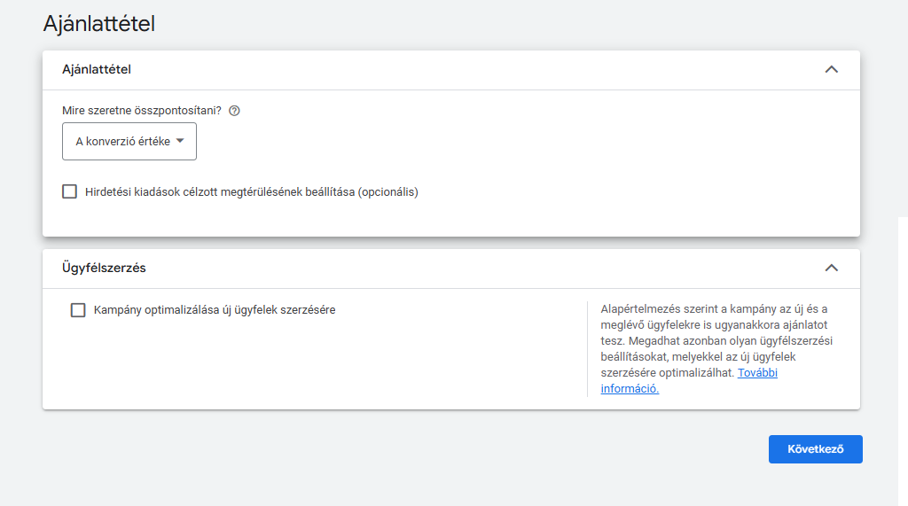 Ajánlattétel és Ügyfélszerzés beállítása: Ajánlattétel választásnál, konverziós értékre rakd, ha webshopod van, szolgáltatóként pedig a konverzióra.