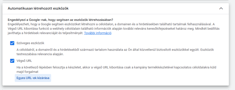 További beállítások: Ezt hagyhatod, mert a google törekedni fog arra, hogy a legjobbat hozza ki és ezt rábízzuk.