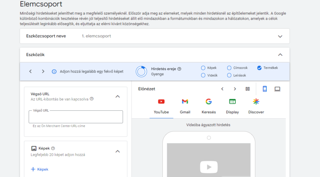 Elemcsoportok létrehozása: Ez megér egy külön bekezdést, később lesz is róla szó, mivel nagyon fontos része a pmax kampánynak.