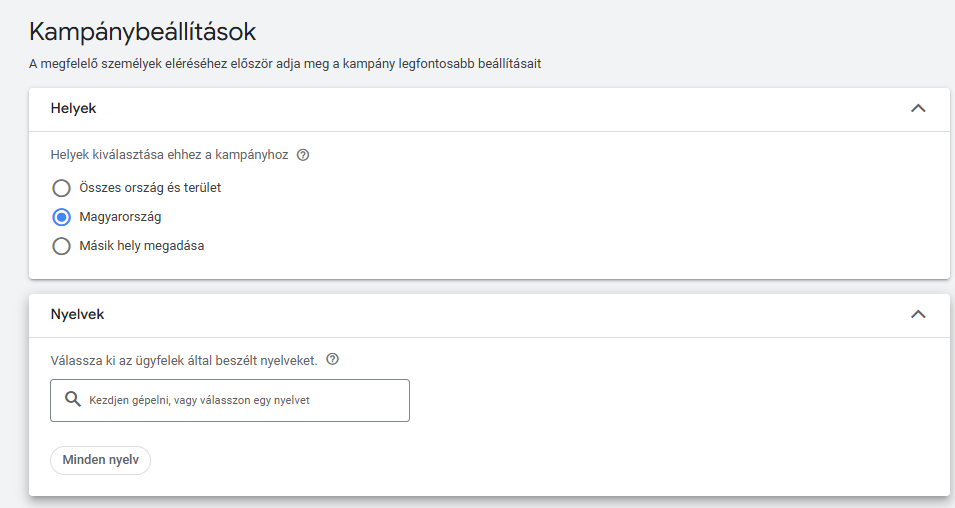 Határozd meg a célzást: Állítsd be a földrajzi és demográfiai célzást. A nyelvnél állíts be minden nyelvet