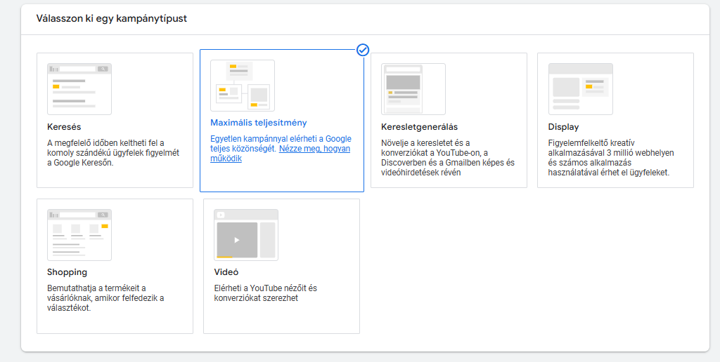 Válaszd a pMax-ot: Válaszd a ‘Google Performance Max (PMax)’ kampánytípust, amely az automatizált gépi tanuláson alapul.