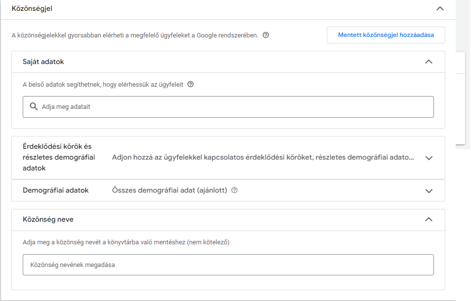 Közönségjel beállítása: Adj meg saját adatokat, érdeklődési köröket és demográfiai adatokat.