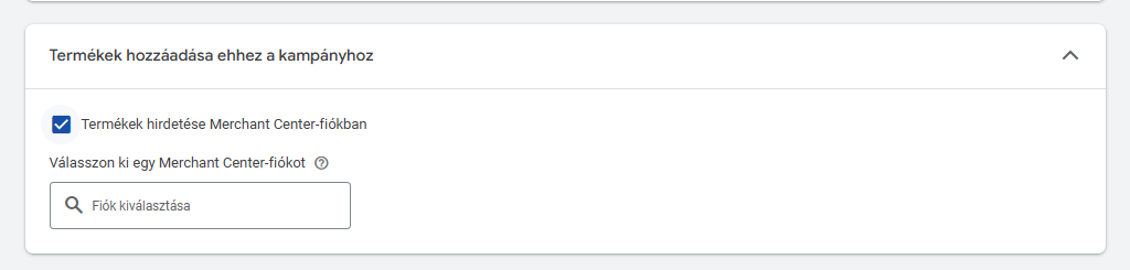 Válaszd ki a Merchant Center fiókot, ha webáruházad van: Válaszd ki a merchant center fiókodat, ha webáruházad van és termékeket szeretnél hirdetni.