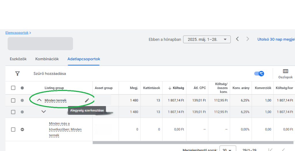 Az hogy a cerura ikon mellett a minden termék kifejezés vagy más lesz, az attól függ, hogy milyen adatlapcsoportot állítottál be az elemcsoporthoz, ha például terméktípus szerint van csoportosítva akkor a kategória neve fog megjelenni és itt kell kattintani a ceruza ikonra.