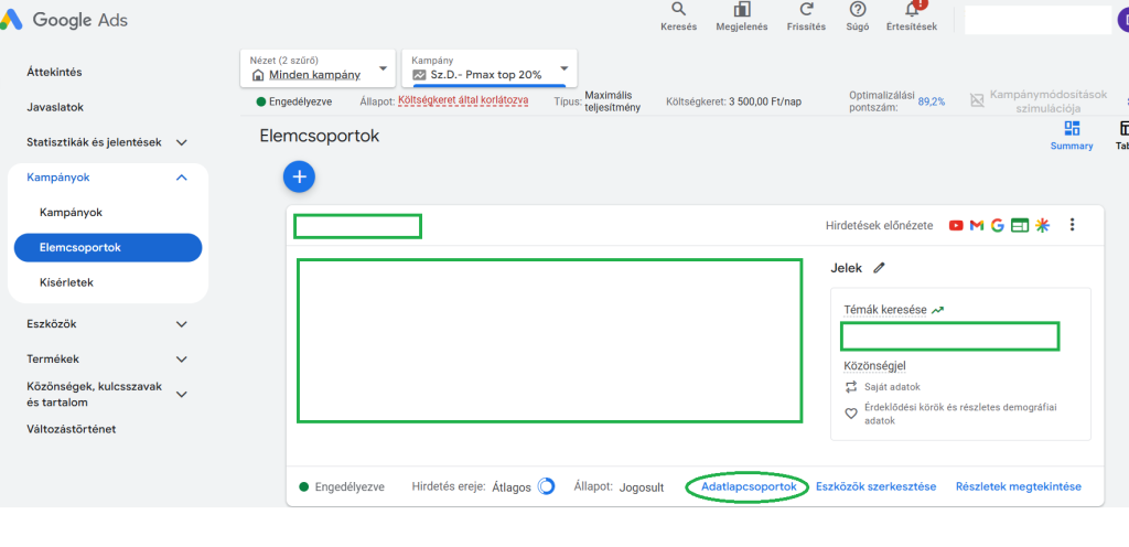 A kiválasztott pmax kampányon belül válaszd az elemcsoportokat és az adott elemcsoportnál pedig kattints az adatlapcsoportok fülre.