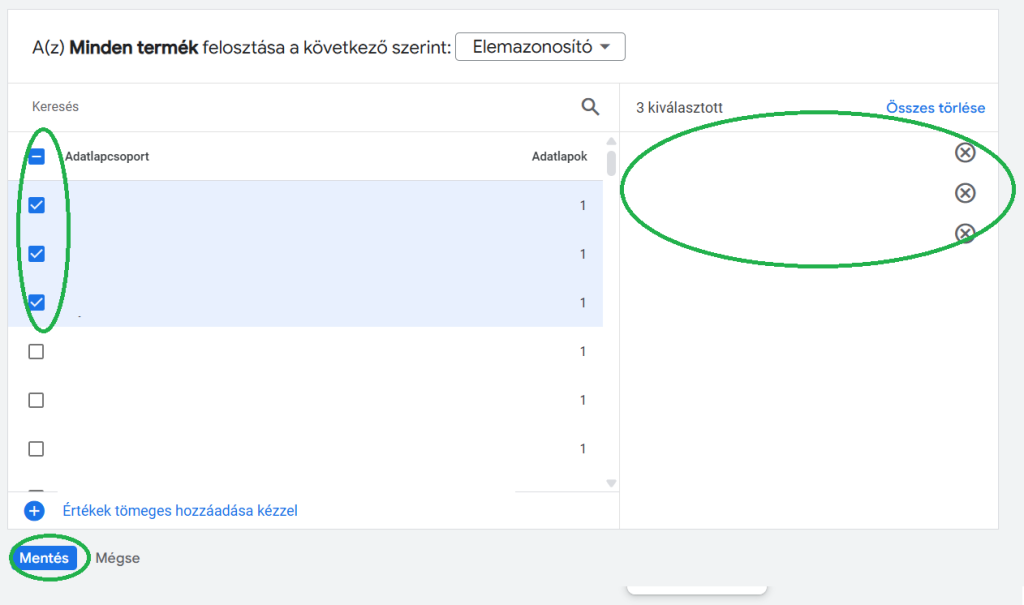 Ezután feltudod osztani a kiválasztott adatlapcsortot Elemazonosító, Terméktípus, Egyéni címke, Márka stb. szerint.