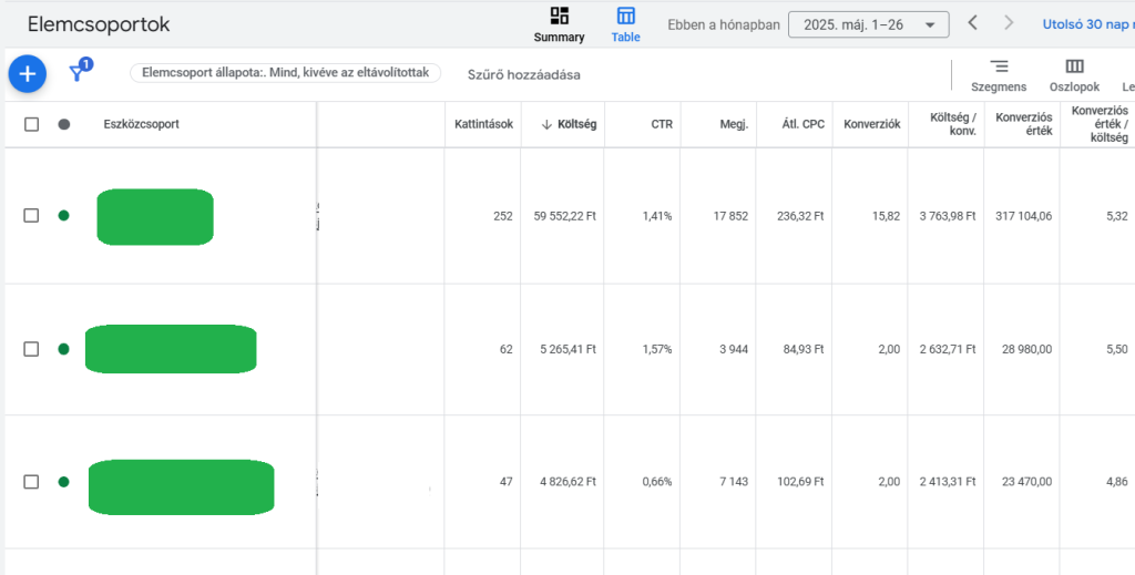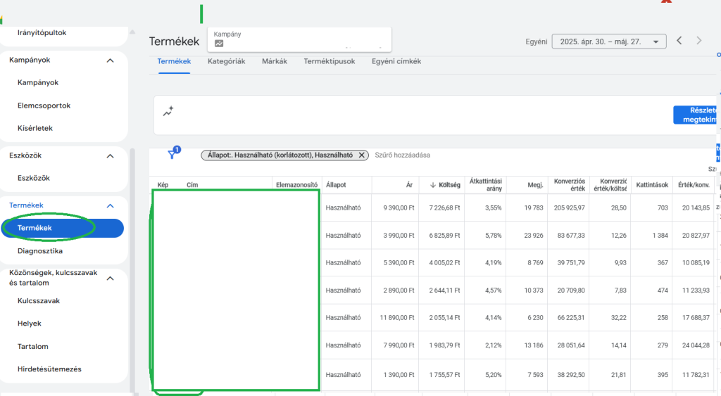 Nyilván ez a legfontosabb. Mely termékek hozzák a legjobb ROAS-t és melyek a gyengén teljesítők?