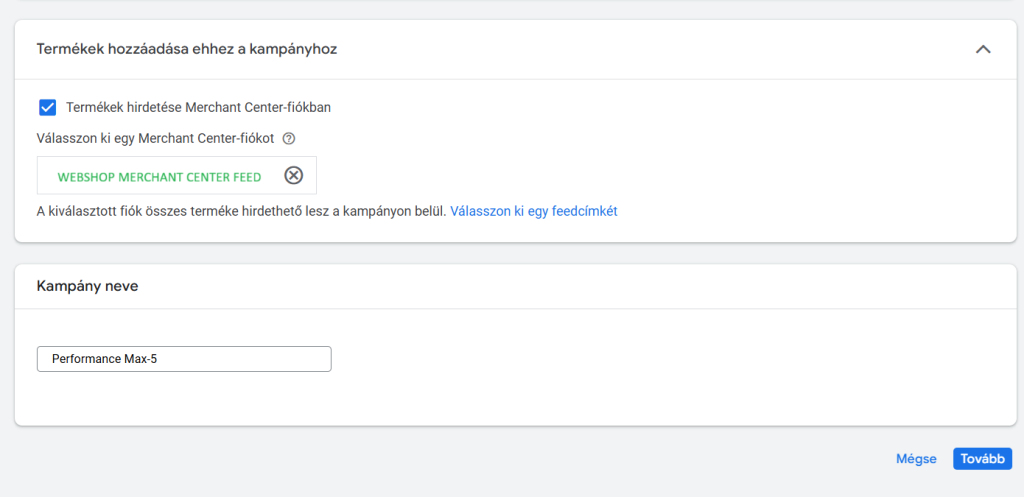 Válaszd ki a webshopod Merchant Center fiókját és add meg a feedet, nevezd el a kampányt majd kattints a tovább gombra.