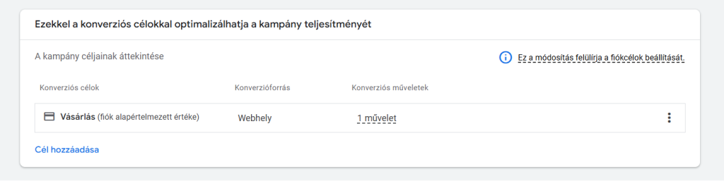 Add meg a vásárlás konverziót. Fontos, hogy csak ez legyen bent, mert erre fog optimalizálni a kampány!