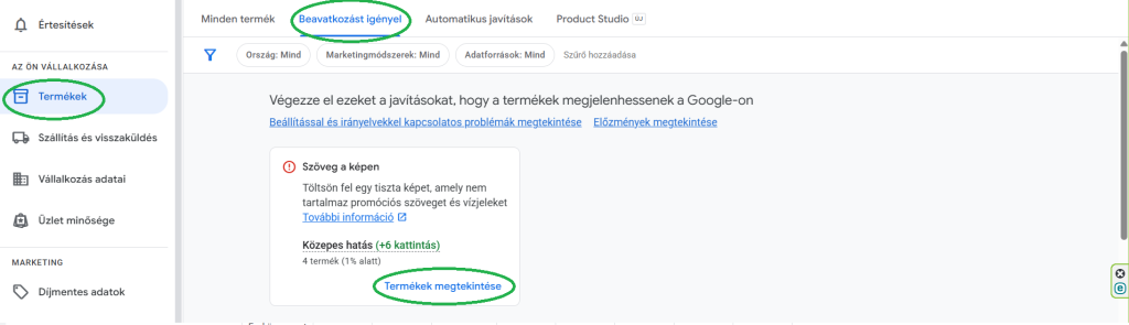 Majd fontos, hogy ellenőrízzük, hogy a Minden termék hirdetése engedélyezve van-e.