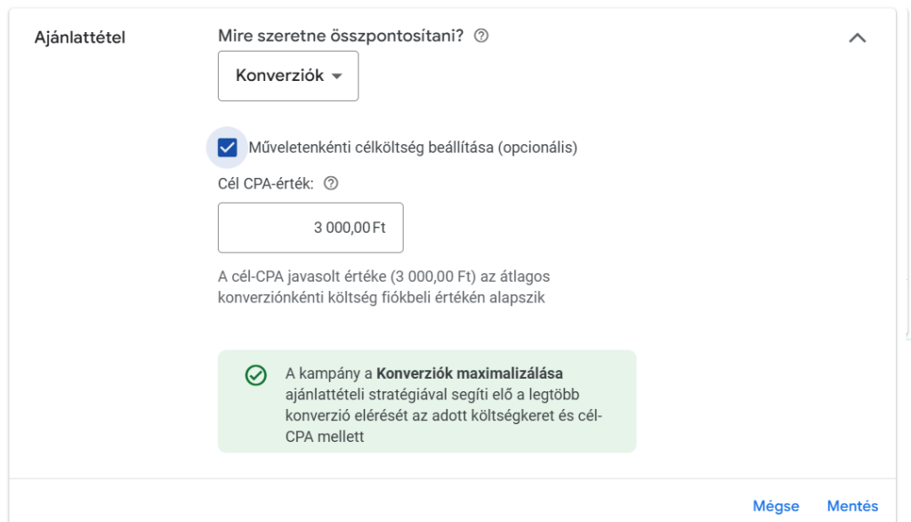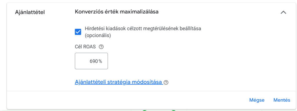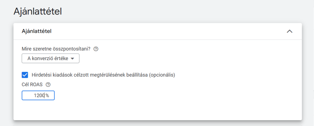 A legtöbb webshop számára a Konverziós érték maximalizálása a legjobb választás, egy reális Cél ROAS megadásával. Kezdetben hagyhatod Cél ROAS nélkül is, hogy a rendszer gyűjtsön adatot, vagy egy korábbi kampányokból származó, óvatos ROAS céllal indíthatsz.