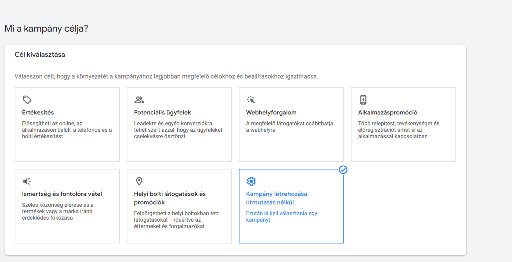 Egyértelműen az Értékesítés (Sales) lesz a célod, de amikor létrehozol egy kampányt nyugodtan állítsd be a kampány létrehozása útmutatás nélkül opciót.