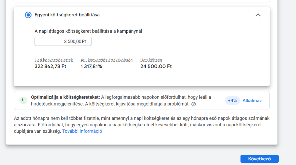 Állíts be egy olyan napi büdzsét, ami legalább 1-2 konverziót képes generálni naponta, hogy a rendszernek legyen miből tanulnia, fontos, hogy legyen legalább egy CPA a költségkeret.
